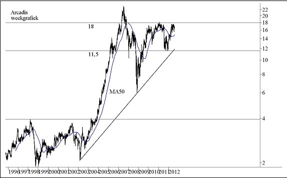 De laatste toets is de feitelijke technische positie. En daarvoor verwijzen wij naar figuur 1. Hierin hebben wij een meerjarige grafiek (1996 – 2012) van de koersontwikkeling van Arcadis opgenomen (weekkoersen).