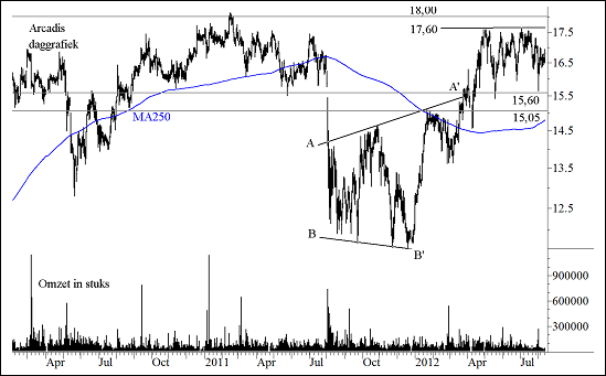 Eind 2011 is een bodempatroon afgesloten dat de vorm heeft van een uit elkaar lopende driehoek (een broadening formation). Men zou dit ook een oplopende kopschouderformatie kunnen noemen waarbij dan de lijn A-A’ de neklijn is. Het koersdoel van dit laatste patroon kan worden berekend op ruim € 18, toevallig ook het niveau waar de belangrijkste lange termijn weerstand ligt. Dat doel is niet helemaal bereikt maar de koers is er wel dichtbij gekomen. Vervolgens is de koers nu al ruim zes maanden bezig met een zijwaartse fase van consolidatie tussen € 15,60 en € 17,60.