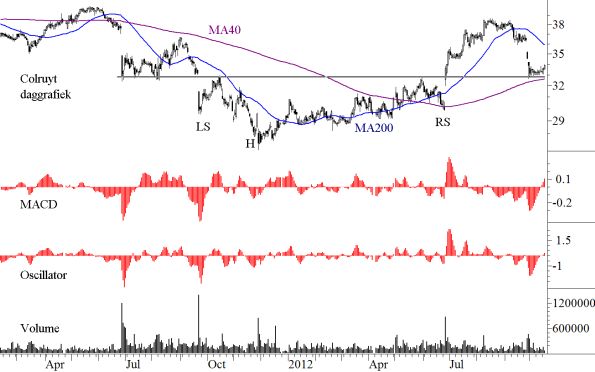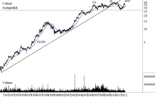 De laatste toets is de feitelijke technische positie. En daarvoor verwijzen wij naar figuur 1 en figuur 2. In figuur 1 hebben wij een meerjarige grafiek van (1989 – 2012) van de koersontwikkeling van Colruyt opgenomen (weekkoersen). Tussen 1989 en eind 2010 is de koers opgelopen in een prachtige grote opgaande trend. Maar eind 2010 kwam het groeipad in de problemen, de koers brak omlaag door de oplopende trend en zakte vervolgens tot op het punt (€ 26,50), dat in september 2007 als steun had gediend en dat nu weer bleek te zijn. In juni 2012 vielen de cijfers dusdanig mee dat de koers een flinke sprong omhoog maakte maar eind september 2012 kondigde Colruyt aan dat voor dit boekjaar een gelijkblijvend resultaat wordt verwacht (op grond van de zomermaanden die kennelijk erg tegenvielen). Het gevaar dat nu in dit beeld opdoemt is dat zich een hele grote lange termijn kopschouder aan het ontwikkelen is met een neklijn op € 26,50. Dat is een zeer negatief beeld, maar zover is het nog lang niet, want de koers moet dan eerst dalen tot dat niveau en er dan ook nog eens doorheen zakken. En niets in de fundamentele ontwikkeling van het bedrijf wijst er op dat er problemen aanstaande zijn die een dergelijk grote koersval rechtvaardigen.