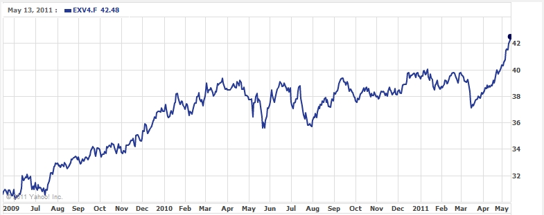 Om met de deur in huis te vallen: de i-Shares STOXX Europe 600 Healthcare steeg in de afgelopen twee jaar bijna 40%. Met deze tracker (een beleggingsinstrument waarmee zo nauwkeurig mogelijk het verloop van een index wordt gevolgd) wordt belegd in de STOXX Europe 600 Health Care Index. De index is samengesteld uit aandelen van Europese bedrijven die actief zijn op het gebied van farmacie en gezondheidszorg, waaronder GlaxoSmithKline, Fresenius, Novartis, Sanofi-Aventis en Roche. Bijgaande grafiek (bron: Yahoo Finance) laat zien dat de tracker sinds mei 2009 een indrukwekkende opmars heeft ingezet.