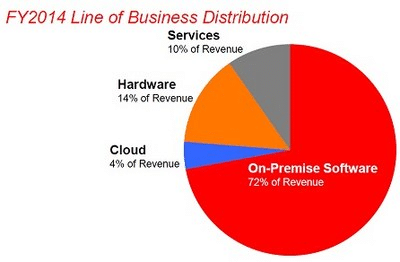 Van huis uit biedt Oracle databasesoftware aan en software die het mogelijk maakt de gegevens in die database te managen en te analyseren. Het was en is de nummer 1 in dat segment. Meer dan 70% van de omzet komt van de verkoop van deze software. Dat is misschien de reden, dat Larry Ellison heel lang geaarzeld heeft om het concept the Cloud te omarmen. Dat betekende, met enige overdrijving, afscheid nemen van een succesvolle formule. Maar nu is het bedrijf definitief om. Volgens Oracle is the Cloud vooral op termijn zeer interessant. Een omzet van $ 1 miljoen nu, zal vijf jaar later een omzet gegenereerd hebben van $ 5 miljoen. Bij het huidige systeem van het verkopen van licenties genereert diezelfde $ 1 miljoen na vijf jaar slechts $ 2 miljoen. Het zijn dit soort overwegingen die bij Oracle en vooral bij oprichter Ellison de doorslag hebben gegeven definitief te kiezen voor het concept van de Cloud.