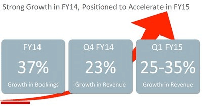 In 2014 genereerde the Cloud slechts 4% van de omzet, maar het optimisme binnen Oracle om snel in de Cloud te kunnen groeien, is groot. Volgens Larry Ellison, die tegenwoordig voorzitter van de Raad van Commissarissen is, zal Oracle zijn omzet in the Cloud sneller laten groeien dan Salesforce.com. Dit bedrijf had in het afgelopen boekjaar een omzet van $ 5 miljard en verwacht daar in het lopende jaar $ 1 miljard aan toe te voegen. Volgens Ellison zal Oracle dit bedrag zeker gaan overtreffen. De omzet van de diverse vormen van Cloudsoftware groeide in het afgelopen kwartaal met meer dan 30%. De orderportefeuille groeide met meer dan 100% en nieuwe klanten blijven toestromen. Volgens topman Mark Hurd kan Oracle dit groeitempo nog wel even vasthouden. Volgens sommige analisten is het zelfs mogelijk, dat Oracle nog dit jaar een omzet van $ 2 miljard zal halen uit alle Cloudactiviteiten. Oracle geniet uiteraard het grote voordeel, dat het al een zeer omvangrijke klantenbasis heeft opgebouwd als aanbieder van software en hardware voor databases. Cross selling biedt dan veel mogelijkheden. De ambitie om ook in the Cloud nummer 1 te worden is dan ook niet zo vreemd!