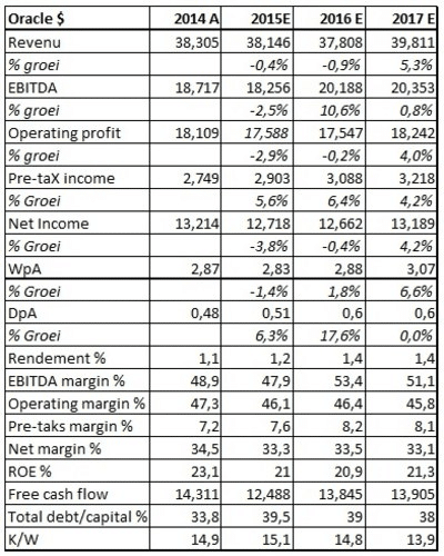 De matige groei van de omzet verhult min of meer dat Oracle er als bedrijf goed voorstaat. Het is nummer 1 in veel van zijn traditionele softwareproducten. Het is waarschijnlijk de snelste groeier als het om the Cloud gaat. Nu de groei in de VS, maar ook in Europa gaat verbeteren, zal Oracle daar ongetwijfeld van gaan profiteren. Dat gaat zich vertalen in een snellere stijging van de winst. Daarnaast heeft Oracle de ambitie uitgesproken om jaarlijks ongeveer 75% van zijn winst te besteden aan inkoop eigen aandelen en aan dividenden. De belegger wordt niet vergeten. Het aandeel Oracle is derhalve geschikt voor zowel de defensieve als gebalanceerde portefeuilles. Het kan ook opgenomen worden in de offensieve portefeuille.