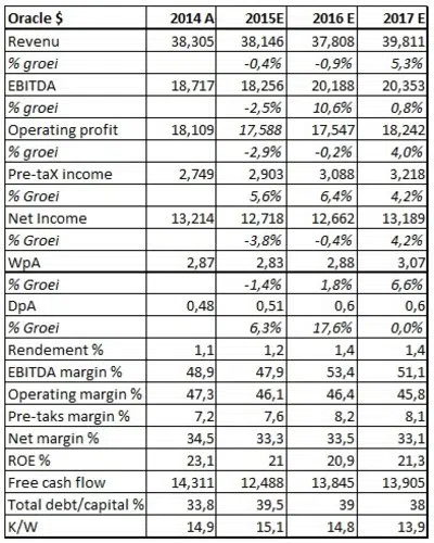 In 2014 zag Oracle de omzet met 4% groeien naar een bedrag van ruim $ 38 miljard. De winst per aandeel steeg met ruim 8% naar $ 2,87 en het dividend per aandeel steeg van $ 0,30 naar $ 0,48. De marktkapitalisatie van Oracle bedraagt $ 186,1 miljard.