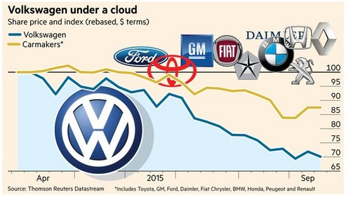 De Europese automobielindustrie zal zich opnieuw op zijn toekomst moeten beraden. Consumenten buiten Europa zullen zeker vraagtekens zetten bij de claims van de Europeanen, dat hun auto’s zo milieuvriendelijk zijn! Niet alleen VW zal hier last van ondervinden, maar zeker ook Duitse concullega’s als Daimler en BMW. Ook zij zagen de koers van hun aandeel dalen na het uitbreken van het schandaal. Waar rook is, is vuur zullen veel beleggers denken! Het schandaal komt ook nog eens op een moment, dat het minder gaat met de sector. Groeimarkten als BraziliĆ«, Rusland en vooral China dreigen te gaan stagneren of stagneren al. Vanaf 2017 moet de industrie er serieus rekening mee houden, dat de verkopen gaan krimpen! Een ongeluk komt nooit alleen!