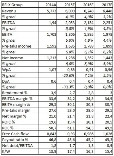 Toch verwacht al in 2017 de eerste vruchten te plukken van de strategische doelstellingen en investeringen. In 2017 moet de omzet van RELX met 4% groeien. Dat zou betekenen dat Risk & Business Information het huidige groeitempo moet handhaven en dat beide andere divisies een (1) procent harder moeten groeien. Dat klinkt niet overdonderend ambitieus, maar dat is het wel. Er zijn sowieso nog maar weinig bedrijven, ook in de mediasector, die een omzetgroei van 4% weten te genereren. Overigens is ook RELX ervan doordrongen dat er meer voor nodig is om een divisie een procentje harder te laten groeien dan louter het aanbieden van nieuwe analysetools. Wel geloven ze dat door deze weg te bewandelen op termijn, bijvoorbeeld na vier jaar de groei wel organisch kan versnellen. Trouwens, sneller groeien is geen absolute doelstelling van RELX! Het bedrijf wil eerste een betrouwbare groeier zijn. Beleggers moeten ervan overtuigd zijn dat het management kan leveren wat het toezegt. De kwalificatie van de uitkomsten over de eerste 9 maanden van 2015 als saai moet het management dan ook als muziek in de oren klinken. Het bevestigde ook de verwachtingen voor heel 2015. De omzet zal uitkomen op een bedrag van GBP 6,1 miljard, de winst voor belastingen op GBP 1,7 miljard en de winst per aandeel op GBP 61 ofwel € 0,85.