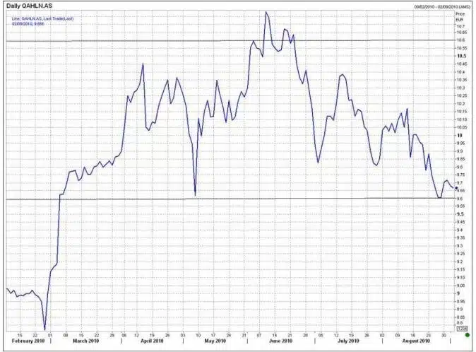 Met een verwachte winst per aandeel van € 0,85 in 2010 en € 1,02 in 2011 bedraagt de koers-winstverhouding op dit moment 11,3 voor dit jaar. Het aandeel noteert op dit moment € 9,68. Het laatste half jaar beweegt het aandeel zich feitelijk tussen de € 9,60 en € 10,60 (zie grafiek). Wat dat betreft lijkt een aankoopkoers van € 9,68 zo gek nog niet. En voor wat het waard is, het gemiddelde koersdoel van analisten bedraagt € 11,69.