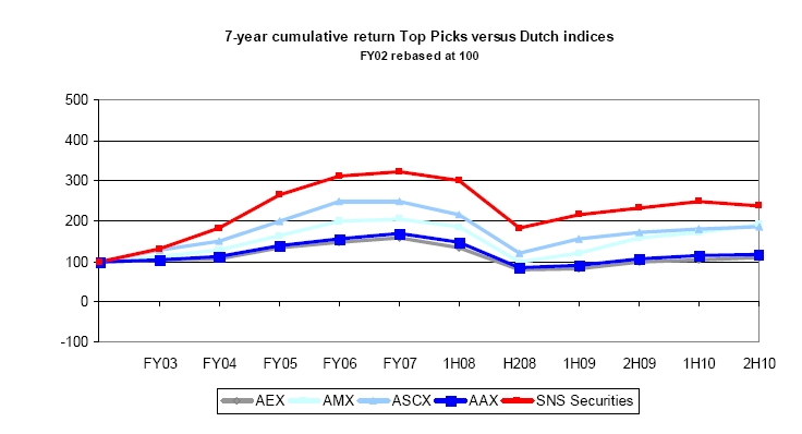 Interessant is dat SNS ook heeft bijghouden wat het rendement van de favoriete aandelen zijn. Vorig jaar stelden zij teleur maar sinds 2003 hebben de top picks van SNS 125% beter dan de AEX en 43% beter dan de AMX gedaan.