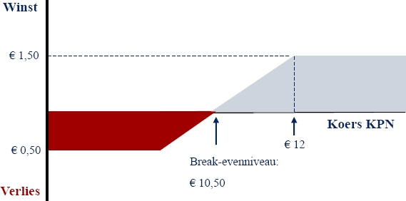 Heeft u net als ik fiducie in het aandeel, dan kunt u ook besluiten de put achterwege te laten. We houden dus het aandeel met een geschreven call over. Vanwege de verkochte call moeten de aandelen op uitoefendatum verkocht worden als de koers van het aandeel boven de uitoefenprijs (12 euro) noteert. Het kan echter voorkomen dat het aandeel eerder dan de afloopdatum verkocht moet worden. Dit zal gebeuren als het aandeel fors boven de uitoefenprijs noteert en er geen verwachtingswaarde meer in de optie aanwezig is. Ondanks dat dan het dividend wordt misgelopen, wordt wel de volledige optiepremie verdient, waardoor er per saldo altijd winst wordt gemaakt. Als KPN in december 2011 hoger noteert dan € 12 moeten de aandelen verkocht worden op € 12. De maximale winst bedraagt derhalve € 2,00 (12 + 0,50 – 10,50). Inclusief het interim dividend 2010 en het dividend 2011 bedraagt de maximale winst € 2,95, oftewel 29,5 %. Op jaarbasis komt dat overeen met een jaarrendement van 17,7 %. Noteert KPN onder de 12 euro dan loopt de call optie waardeloos af. Vanwege de ontvangen premie bedraagt het totale dividendrendement geen 9 %, maar 9,5 %.