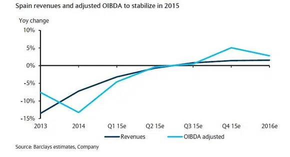 Telefonica liet bij de presentatie van de resultaten over het eerste kwartaal 2015 weten dat ze er voor Spanje vanuit gaan dat waarschijnlijk nog in de tweede helft van dit jaar de krimp kan omslaan in groei. Het management wijst daarbij op het sterke economische herstel in het land. Spanje is met 3% de snelste groeier in de eurozone. Dankzij dat herstel heeft Telefonica het aangedurfd om voor een beperkt aantal van zijn producten en diensten de prijzen te verhogen. Geleidelijk aan zullen steeds meer prijsverhogingen volgen. De Spanjaarden zijn niet bang dat bestaande klanten massaal voor een andere operator gaan kiezen. Dat gebeurt slechts op beperkte schaal tot dusverre. De geringe leegloop laat zich gemakkelijk verklaren. Andere aanbieders zoals Vodafone en Orange hebben ook plannen om hun prijzen te gaan verhogen. Analisten gaan ervan uit dat de prijsverhogingen Telefoncia in 2015 ruim € 300 miljoen oplevert en in 2016 ruim € 400 miljoen. Dankzij deze bedragen wordt de krimp in 2015 een halt toegeroepen en in 2016 zal de omzet weer een groei vertonen.