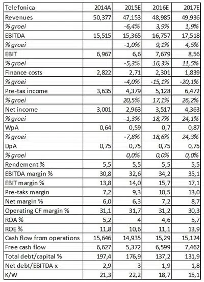 Het lopende jaar, 2015, is het jaar van de ommekeer. Althans, dat beweert het management. Vooralsnog lijkt Telefonica zowel in Europa als in Latijns Amerika de juiste beslissingen genomen te hebben. Het komende jaar, 2016, moet een eerste oogstjaar worden. Omzet en winst zullen dan weer groeien. Misschien zit er zelfs nog een verbetering van het dividend in het vat maar dat is nog uiterst onzeker. Een geschat dividendrendement van 5,5%, gekoppeld aan een herstel van de winst per aandeel maakt van Telefonica weer een aantrekkelijk aandeel voor elke beleggingsportefeuille. Het aandeel is echter wel aan de prijs. Het bedrijf moet bovendien de komende jaren hard werken om zijn schuldenlast van € 45 miljard te verlagen. Een te hoge schuldenlast kan een toekomstige expansie in de weg staan.