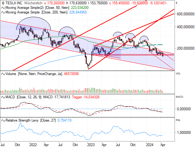 In de afgelopen 27 weken heeft het aandeel Tesla een RSL-waarde (Relatieve Sterkte Lijn) van 0,75 laten zien. Dit betekent dat het aandeel momenteel een van de relatief zwakste is in de Nasdaq-100. Het beeld van de grafiek ziet er ook niet goed uit, want sinds het begin van het jaar heeft het aandeel van de autofabrikant veel waarde verloren.