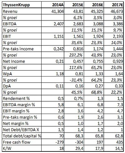 Sinds het begin van 2015 is de waarschijnlijkheid toegenomen, dat ThyssenKrupp zijn doelstellingen zal kunnen bereiken. Bij concurrenten als ArcelorMittal en Voestalpine overheerste een gematigd optimisme over de staat van de sector. Dat optimisme vindt steun in de voorspelde verbetering van de economische groei in de thuismarkt Europa. Dat neemt niet weg, dat ThyssenKrupp midden in een turnaround zit met alle risico’s van dien. Dat maakt het aandeel sowieso ongeschikt voor de defensieve en gebalanceerde portefeuilles. Het past wel in de offensieve portefeuille van beleggers die een turnaroud zien als basis voor een versnelde winstgroei!