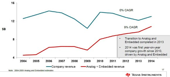 De strategische beslissing in 2004 om het accent te leggen op de productie van analoge en embedded halfgeleiders heeft pas in 2014 voor het eerste positief bijgedragen aan de ontwikkeling van de omzet. Het management denkt dat dankzij deze beslissing de doelstelling van een omzet van $ 15 miljard binnen handbereik is gekomen, zeker nu TI erin slaagt zijn marktaandeel in analoog (18%) en embedded (15%) te vergroten.