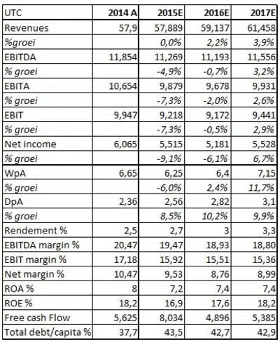 Het afgelopen jaar werd dan ook een jaar van de ene neerwaartse bijstelling na de andere, waarbij kwartaalresultaten teleurstelden. Beleggers keerden het aandeel massaal de rug toe. Aan het eind van 2015 lijkt het erop dat UTC in een nieuw evenwicht is beland. Er is een nieuw management, een nieuwe organisatie en het management informatiesysteem levert de data die het topmanagement in staat stelt betere beslissingen te nemen. Het gevolg van Chevenert heeft de organisatie al dan niet vrijwillig verlaten. Belangrijk is ook dat het bedrijf het sturen op de groei van de winst per aandeel en op vrije kasstromen grotendeels heeft losgelaten.