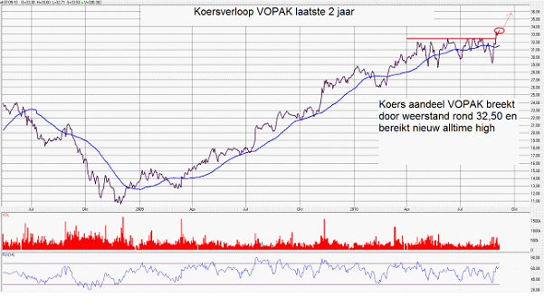 Gelijkopgaand met herstellende beurzen wereldwijd zette de koers van VOPAK vanaf maart 2009 een indrukwekkende stijging in die tot op de dag van vandaag voortduurt. De koers is meer dan verdubbeld waarmee het aandeel relatief veel beter presteert dan de index. Op 32,50 euro vormde zich vanaf april dit jaar een weerstand, waar de koers vorige week doorheen brak als beloning voor de goede halfjaarcijfers en de opgeschroefde verwachtingen van het bedrijf. VOPAK is een van de weinige Nederlandse aandelen die nu op een alltime high noteert, toch wel bijzonder afgezet tegen de AEX die nog niet op de helft van het hoogste punt ooit zit en ook bijzonder in het licht van de moeilijke economische realiteit. Het bedrijf profiteert echter overduidelijk van de nog steeds groeiende vraag naar transport en tankopslag welke de gestaag opkomende (Aziatische) markten met zich meebrengt.
