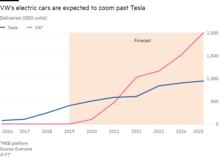 De ambities zijn torenhoog, want in 2025 moeten 3 miljoen elektrische auto’s bij VW van de band rollen tegen 40.000 in 2018. Beleggers en analisten zijn het erover eens, dat veel zal afhangen van het chassis of platform. Als het platform het verhoopte succes wordt, dan kan VW wel eens een dominante speler worden op de markt voor de elektrische auto. MEB is niet alleen een platform of een template maar zal VW fundamenteel gaan veranderen, organisatorisch, qua supply chain of kwalitatief. VW gaat dan ook het lieve sommetje van Euro 30 miljard investeren in dit project.