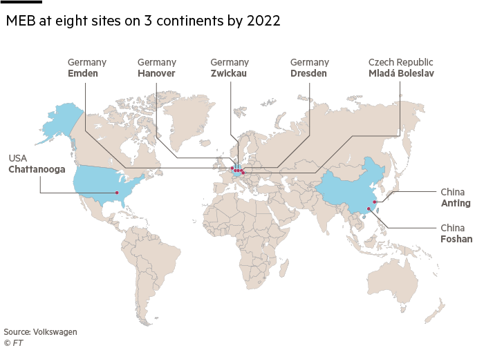 Tot dusverre heeft VW het rustig aangedaan met MEB. Daar kan dit jaar verandering in komen als het echt gereed is voor productie. Dan moet het ook hard gaan. Dan moeten er in 2022 op drie continenten 8 fabrieken het platform gebruiken. Dat moet ook wel, wil VW in 2025 zijn 3 miljoen elektrische auto’s uitspuwen. De ambitie is ook, dat de auto die van het platform rolt in 2021 winstgevend moet zijn. Dat moet mogelijk zijn, als VW in staat zal zijn om het aantal uren waarin een auto gebouwd kan worden dramatisch te verlagen. Daardoor kunnen de productiekosten drastisch omlaag. Nu al is de winst 35%. De klassieke auto wordt in 26 – 32 uur gebouwd, maar de elektrische auto loopt al na 16 uur van de band.