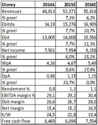 Voor veel analisten is het een bijna uitgemaakte zaak dat 2015 en de jaren daarna hele mooie jaren worden voor Disney. Zij gaan uit van een dubbelcijferige winstgroei juist omdat de verbetering van het resultaat door het hele bedrijf gedragen wordt. De inkoop van eigen aandelen moet de groei van de winst per aandeel ondersteunen.