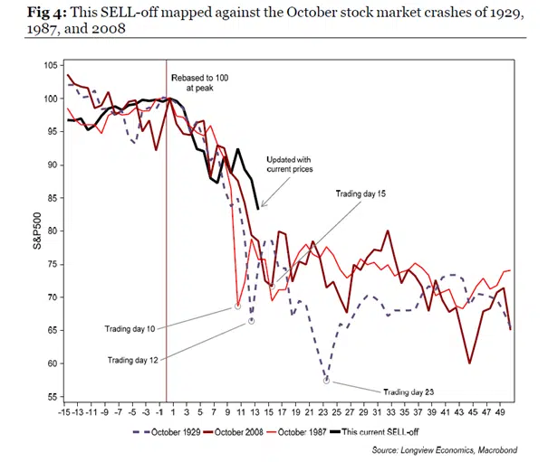 Voorbeelden uit 2011 en 2018 leren dat koersen over een maand niet hoger hoeven te zijn dan nu het geval is. Ook 1929, 1987 en 2008 laten hetzelfde beeld zien. Het duurt op zijn minst enkele weken voordat markten uitgebodemd zijn.