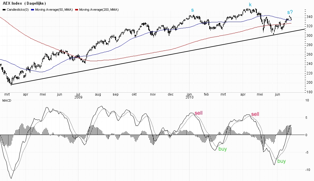 Ik hou een combinatie van een aantal signalen naast bovenstaande events in de gaten. De MACD heeft een mooie opwaartse beweging laten zien maar lijkt aan het einde van zijn Latijn te zijn. Op weekbasis is op de voornaamste indices een kop-schouder patroon aan het ontwikkelen, met op de AEX de neklijn op ongeveer 300-305 punten. De AEX lijkt op het moment de 200MA te testen.