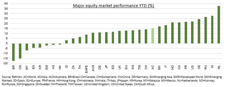 Europese tech is de miskende outperformer dit jaar en wordt verhandeld tegen enkele van de hoogste waarderingen wereldwijd. Dit weerspiegelt zowel een premie voor relatieve schaarste als het ontbreken van juridische tegenwind. Daarnaast heeft Nederland zich ontwikkeld tot een hub voor tech-noteringen, zowel voor Nederlandse als buitenlandse fondsen, met bedrijven zoals Adyen (ADYEN.NV), Prosus (PRX.NV) en Just Eat (TKWY.NV), maar ook het Poolse InPost en Spaanse Allfunds. De derde drijfveer voor het Nederlandse succes is het sterke wereldwijde herstel van de bestedingen en de handel. 80% van de inkomsten van Nederlandse bedrijven komt uit het buitenland, terwijl dit in de grote markten gemiddeld aanzienlijk lager ligt.
