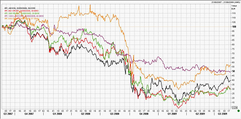 Het mag geen verrassing zijn dat de koersen van de financials de laatste jaren fors zijn gedaald. Aegon (de zwarte lijn) is in twee jaar tijd met ruim 60 % gedaald, ING (de rode lijn) met bijna 70 %, Van Lanschot met ruim 50 % en Kasbank is gedaald met circa 45 %.