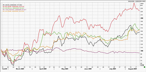 Kijken we echter naar de laatste 6 maanden, dan is het beeld compleet anders. Uit de grafiek is op te maken dat de koersen fors zijn hersteld. Alleen van Lanschot weet geen plus te realiseren.