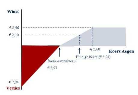 Hoewel ik redelijk positief ben over het aandeel Aegon, moet ik helaas toegeven dat ook ik geen glazen bol heb. Ik ben dus op zoek gegaan naar een constructie die ook een aardig rendement oplevert bij een kwakkelende beurskoers. Doordat de beweeglijkheid op de beurs weer wat is toegenomen, ben ik van mening dat bovenstaande constructie een acceptabele combinatie is. Het is natuurlijk aan uzelf om te bepalen of u het hier mee eens bent.