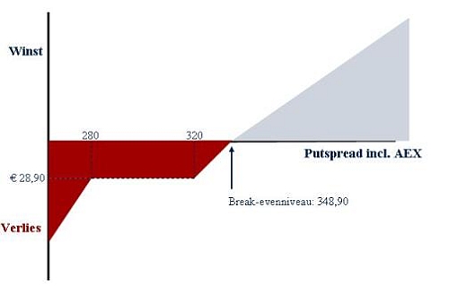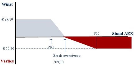 De putspread kost nu 3,2 % van de index en ons break even niveau is 309,1. Onder 280 punten lopen de winst op de long put en het verlies op de short put tegen elkaar weg. Er is dan geen verdere bescherming meer. Het resultaat blijft 29,10 (=320 – 280 – 10,90). Stel de AEX is gedaald naar 250 punten, dan keert de put 320 70 euro uit en voor de put 280 moeten we 30 betalen. We behalen een winst van € 40, maar hier moeten we onze investering van € 10,90 nog vanaf halen. Na aftrek van de premie van 10,90 resteert dus een maximale winst van € 29,10 bij een stand van 280 of lager.