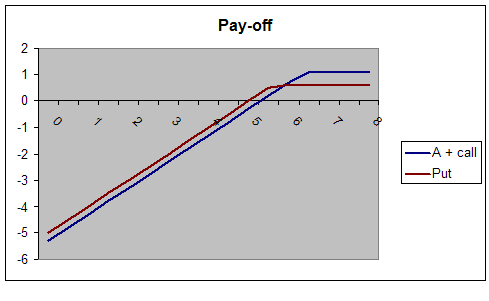 Uit bovenstaande grafieken blijkt dat het aandeel met short call een hogere maximale winst heeft, maar tevens een groter maximaal verlies. Ook ligt het break-even punt anders. Bij het aandeel met call is de maximale winst € 1,10, het maximale verlies € 5,30 en het break-even punt ligt op € 5,30. Bij de short put is de maximale winst € 0,60, het maximale verlies € 5,00 en het break-even punt ligt hiermee dus ook op € 5,00.