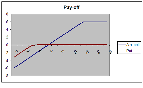 Bij het onderstaande voorbeeld heb ik wat gekke uitoefenprijzen gekozen om het verschil tussen beide combinaties duidelijk te maken. Tevens zijn de prijzen gebaseerd op de slotkoersen van vrijdag. Ik koop het aandeel op € 5,96 en verkoop de call dec 2011 met uitoefenprijs 12 voor € 0,06 en verkoop de put dec 2011 met uitoefenprijs € 3,20 voor € 0,07. Hieronder vindt u wederom de pay-off grafieken. Vanwege de extreme uitoefenprijzen blijken de verschillen pas goed. De reden is eigenlijk vrij simpel. Beide opties zijn zwaar out-of-the money waardoor je bij het aandeel met short call eigenlijk alleen het aandeel hebt en bij de short put feitelijk nauwelijks een aandeel koopt.