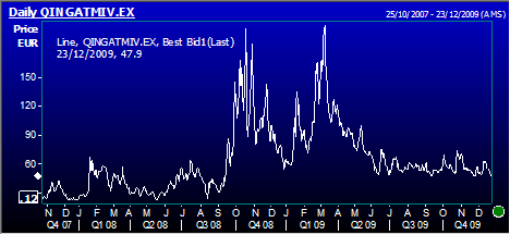 In onderstaande grafiek ziet u de beweeglijkheid (de volatiliteit) van het aandeel ING. De vollie bedraagt op dit moment circa 48 %. Ter vergelijking, de vollie van de AEX bedraagt circa 23 %.