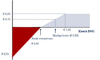 Een alternatief zou het aandeel ING kunnen zijn. Uiteraard is er bijzonder veel met dit bedrijf aan de hand, maar een groot gedeelte van dit slechte nieuws zit min of meer al in de koers verwerkt. Net als Arcelor Mittal is ING op dit moment zeer bewegelijk. Vanwege de hoge beweeglijkheid van het aandeel leveren opties relatief veel op en dus besluit ik wederom een strangle te verkopen. Wel wil ik u erop wijzen dat het aandeel al behoorlijk risicovol is en het verkopen van een strangle of straddle de positie nog risicovoller maakt. Het is dus verstandig de positie niet al te groot te doen en uiteraard de positie zeer goed te blijven volgen.