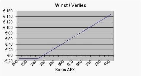 We kopen de call AEX december 2010 met uitoefenprijs 240. Bij de huidige stand van de AEX (277) is de intrinsieke waarde van deze optie ⬠37. De optie noteert ⬠52 zodat de verwachtingswaarde ⬠15 bedraagt. We verkopen de call AEX aug 2009 met uitoefenprijs 290. Deze call levert ⬠2,35 op. In één maand ontvangen we al 4,5 % van de kostprijs van de gekochte call. Als de AEX eind augustus lager noteert dan 290 dan loopt de verkochte call waardeloos af. Daarboven heeft de verkochte call intrinsieke waarde gekregen. Staat de AEX bijvoorbeeld 300, dan is de koers van de verkochte call op afloopdatum 10 euro. We hebben dus een verlies van ⬠7,65. De gekochte call maakt dit echter meer dan goed.