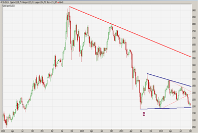 De ontwikkeling van de goudprijs doet ondertussen niet vermoeden dat de wereld zich al afkeert van het reguliere geld en het monetaire stelsel. De dreigende topvorming op een aantal beurzen heeft kennelijk nog geen stimulerende gevolgen voor de goudprijs. De steeds vaker opduikende verhalen over deflatie spelen het edele gele metaal bovendien evenmin in de kaart. Als de goudprijs beneden lijn B komt dan zijn zelfs buitenproportionele reacties op de markt niet ondenkbaar. Voor de uitgevers van “papieren goud” en daaronder vallen zeer machtige (zaken)banken, ontstaat dan een mooie mogelijkheid de bij hoge prijzen verkochte verplichtingen goedkoop af te sluiten.
