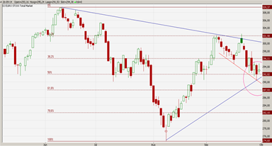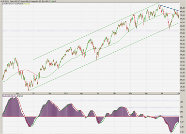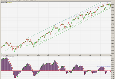 Hoewel het lange termijn beeld er op het eerste gezicht beter uitziet geldt, bij nadere beschouwing, ook hier dat de kans op topvorming reëel moet worden geacht. Het feit dat de onderkant van het opgaande trendkanaal in 2014 regelmatig wordt aangetikt en de bovenkant na medio 2013 niet meer duidt op afnemende groeikracht; ook de lager wordende toppen van de MACD (negatieve divergentie met de hogere koerstoppen) wijzen in die richting.