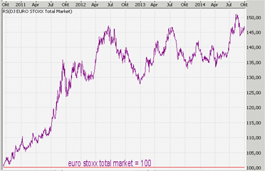 Dat niet alle Europese beurzen slecht presteerden moge duidelijk worden uit de onderstaande grafiek. De relatieve sterkte van een aantal indexen is daar weergegeven t.o.v. de DJ Euro STOXX total market. De variabele index (bv AEX) wordt op 100 gesteld (rode lijn) en de prestatie van de benchmarkindex (hier Eurostoxx total market) t.o.v de vergeleken beursindex is de paarse lijn. De DAX en de AEX doen het dus (vanaf eind 2010) gemiddeld beter dan de Europese index. De CAC40, de IBEX en de MIB blijven daarentegen achter.