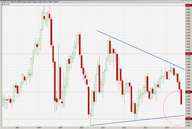 De dalende Eurowaarde is in de hierna volgende maandgrafiek goed zichtbaar. Beneden de waarde van $1,26 is er volop ruimte voor een versnelde neergang. Op zich is een dalende Euro niet ongunstig voor een aantal Europese economieën. Zuidelijke Eurolanden zullen daardoor, zo is de verwachting, makkelijker kunnen exporteren en hun economieën revitaliseren. In hoeverre die ontwikkeling voor Nederland, dat een extreem groot handelsoverschot met het buitenland heeft, gunstig is valt te bezien. Het Nederlandse overschot op de betalingsbalans wijst op een kolossaal spaaroverschot, dus op te weinig (binnenlandse) investeringen van bedrijven en overheid. De overschotten worden kennelijk in het buitenland belegd (geïnvesteerd). Dat gaat zich op den duur vertalen in afnemende binnenlandse economische groei, achterblijvende voorzieningen en stagnerende werkgelegenheid.