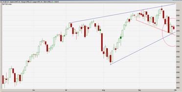 De strategieën van Invest4You zijn gedurende het derde kwartaal uiterst voorzichtig en terughoudend bij het investeren geweest. Dit was te merken aan de mate waarin de toevertrouwde gelden in aandelen belegd waren. Hoewel daardoor de performances van de meeste strategieën achterbleven is toch gekozen voor veiligheid. De redenen daarvoor worden duidelijk als het verloop van enkele belangrijke indexen wordt bezien. Het verloop van de Amerikaanse Standard & Poor 500 index liet behalve grote fluctuaties op dag- en maandbasis ook zien dat de mogelijkheid van een neerwaartse uitbraak, ondanks geruststellende taal van de officiële Amerikaanse instanties, aanwezig is. Een neerwaartse doorbraak van de rode en de blauwe lijnen binnen het omcirkelde gebied kan als het hijsen van de stormvlag worden beoordeeld.