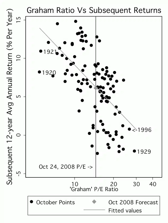 Dit figuur, afkomstig van Chris Carroll, toont het verband tussen de koerswinstverhouding van een beurs (winsten zijn een tienjarig gemiddelde) en de daarop volgende twaalfjarig reëel rendement op aandelen. Hoe hoger de koerswinstverhouding, dat wil zeggen, hoe “duurder” aandelen zijn, des te minder rendement voorzien kan worden. Omgekeerd kun je meer rendement verwachten als aandelen “goedkoop” zijn .