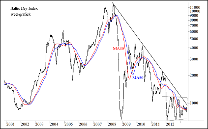 Deze index bevond zich tussen 2008 en begin 2013 in een lange dalende trend. Maar afgelopen week is de lange termijn dalende trend in opwaartse richting verbroken. Men kan nu spreken van een bodemproces, dat gedurende 2012 en de eerste helft van 2013 heeft plaatsgevonden. Die bodem (in de figuur gemarkeerd door twee licht naar elkaar toelopende horizontale lijnen) is nog niet voltooid, daartoe moet de koers van de index tot boven de toppen uit 2012 stijgen, maar dat lijkt nog slechts een kwestie van tijd. Een uitbraak omhoog ondersteunt de verwachting dat de wereldeconomie aan de vooravond staat van een opleving.