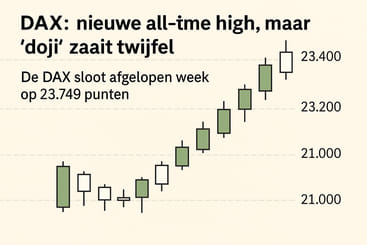 De DAX staat op een record, maar een doji na zes witte weekcandles roept vragen op. Blijft de opmars intact of komt er een correctie?