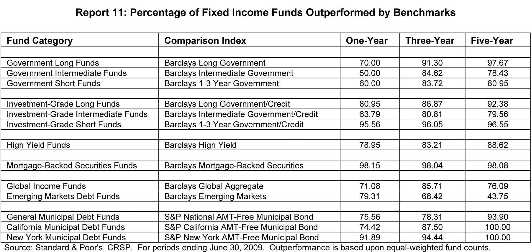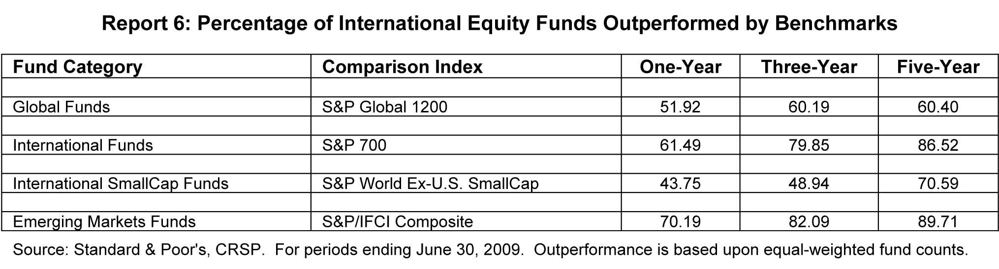 Bij beleggingsfondsen die in aandelen uit de opkomende landen beleggen wordt maar liefst 89,71 % verslagen door de markt. Dat betekent grofweg dat een belegger een kans heeft van ca. 10 % dat hij een beleggingsfonds weet te selecteren dat de markt weet te verslaan.