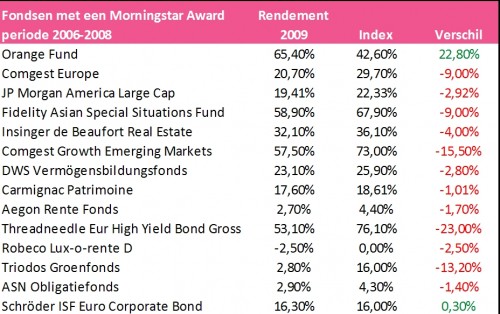 Eigenwijs als ik ben, heb ik alle beleggingsfondsen die vorig jaar met veel trompet en klaroengeschal een Morningstar Award hebben ontvangen, bekeken op de gerealiseerde rendementen over het jaar 2009.