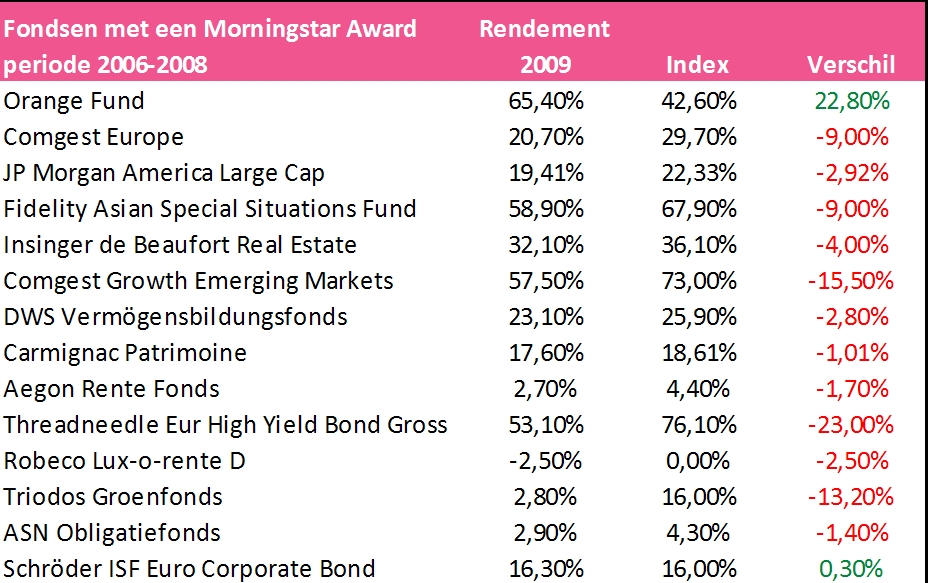 Van de huidige 13 beleggingsfondsen die in maart 2010 in hun categorie een Morningstar Award hebben ontvangen, presteren er drie fondsen over een periode van 8 jaar sowieso slechter dan de benchmark en leveren drie fondsen een marginaal hogere prestatie dan de benchmark.