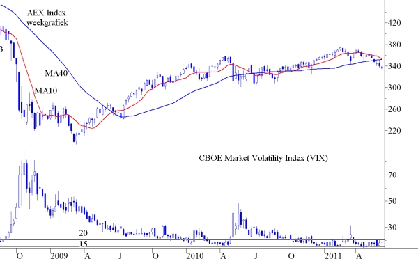Men ziet dat de VIX op weekbasis ook met de AEX Index in harmonie leeft. Hij maakt zijn toppen soms iets te vroeg en zet de daling soms ook te snel in, maat grosso modo is de relatie in orde. Maar als dekkinginstrument van de portefeuille heeft hij het moeilijk. Men moet, net zoals bij de S&P500, in staat zijn een top te definiëren en dat is niet iedereen gegeven. Als men een goed exitsignaal zou kunnen creëren dan kan het een zeer interessant instrument zijn om in moeilijke beurstijden de portefeuille een extra oorlogskas te geven en daarmee een stuk bescherming.