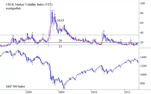 Wij laten u hieronder een grafiek zien van de 30-daags VIX Index op weekbasis.