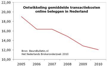 De toenemende concurrentie heeft gezorgd dat dit jaar de tarieven verder zijn verlaagd, wat uiteraard een gunstige ontwikkeling is voor de belegger. Desalniettemin is er nog steeds een groot verschil tussen de aanbieders, voornamelijk veroorzaakt door de toeslagen bij het plaatsen van telefonische orders. De grafiek illustreert de neergaande trend qua kosten voor online beleggen.