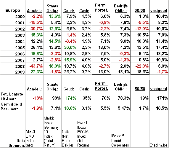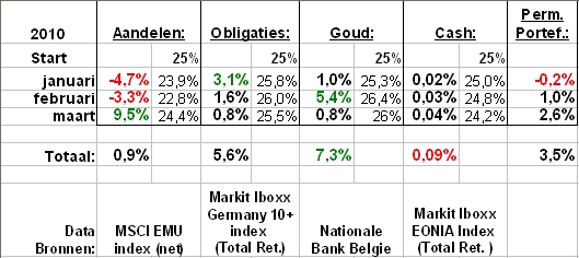 Ondanks de recente rally in aandelen (+9,5% in maart) zijn ze met +0,9% nauwelijks gestegen dit jaar. Net zoals in het rampenjaar 2008, zijn het weer obligaties (+5,6%) en vooral goud (+7,3%) die de kar trekken in 2010 en de permanente portefeuille reeds +3,5% rendement heeft opgeleverd.